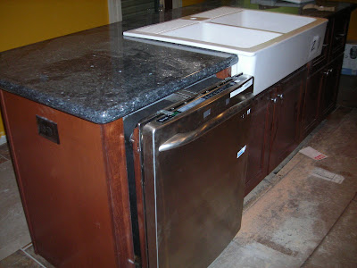 We got granite countertops today! The guys are awesome! They pulled up at 10AM as promised and worked 3 hours to install these babies, including cutting the island right on site! Here they are minus the sink: